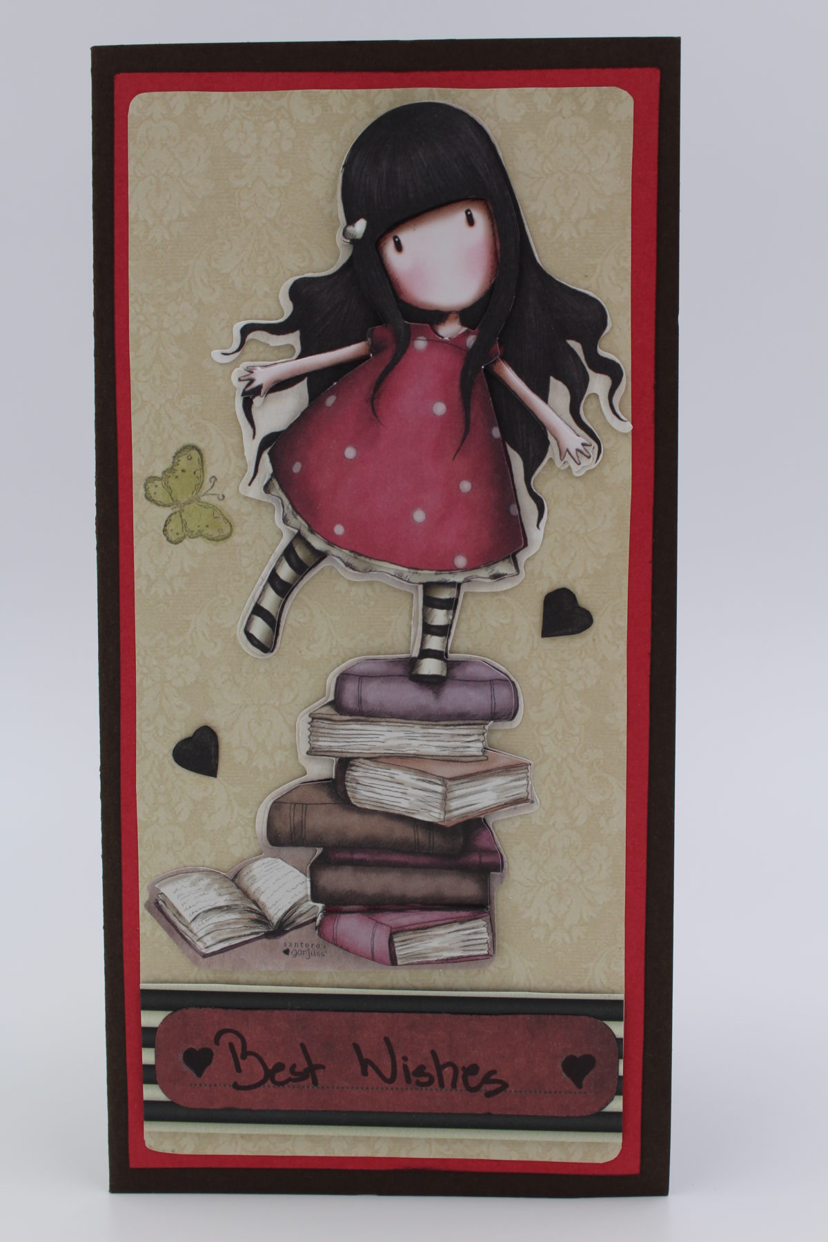 Kartkę zrobiłam wieki temu. Spodobała mi się ta mała dziewczynka stojąca na książkach jest taka wesoła a jednocześnie roztargniona jakby miała zaraz spaść w dół. Urocze są jej wypieki. Kartka powędrowała dla kogoś kto uwielbia czytać książki.