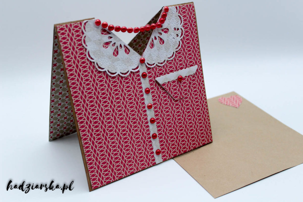 Kartka ma czerwone perełki które trochę przypominają guziki i korale na bluzce. Kartkę można zrobić w różnych kolorach i z różną „biżuterią” w z ależności od potrzeb. Resztę zostawiam waszej kreatywności.