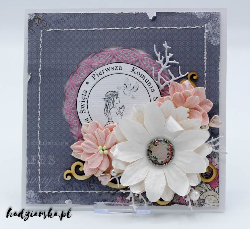 Wykorzystałam „Isabella designer paper stack Bo Bunny ” Ma bardzo fajne kolory to połączenie różu bieli i szarości. Wydaje mi się że można je zastosować na komunie, urodziny czy imieniny. Ma także w zestawie tagi które można wykorzystać jako np. dodatek ,napis z których także można coś wyciąć…